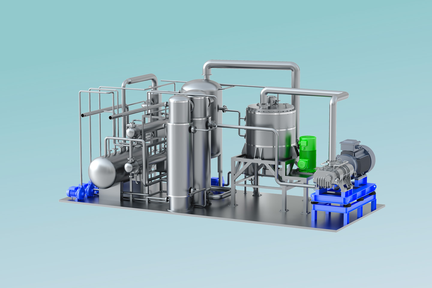 MVR熱泵精餾系統(tǒng)以高效旋轉(zhuǎn)精餾床為基礎(chǔ),利用離心力場(chǎng)代替重力場(chǎng),強(qiáng)化相與相之間的相對(duì)速度和相互接觸,通過(guò)強(qiáng)化傳質(zhì)傳熱來(lái)提高分離效率縮小設(shè)備體積。 通過(guò)在系統(tǒng)中引入適用于小流量、大壓比的螺桿式蒸汽壓縮機(jī),即可實(shí)現(xiàn)MVR循環(huán)熱泵精餾。
